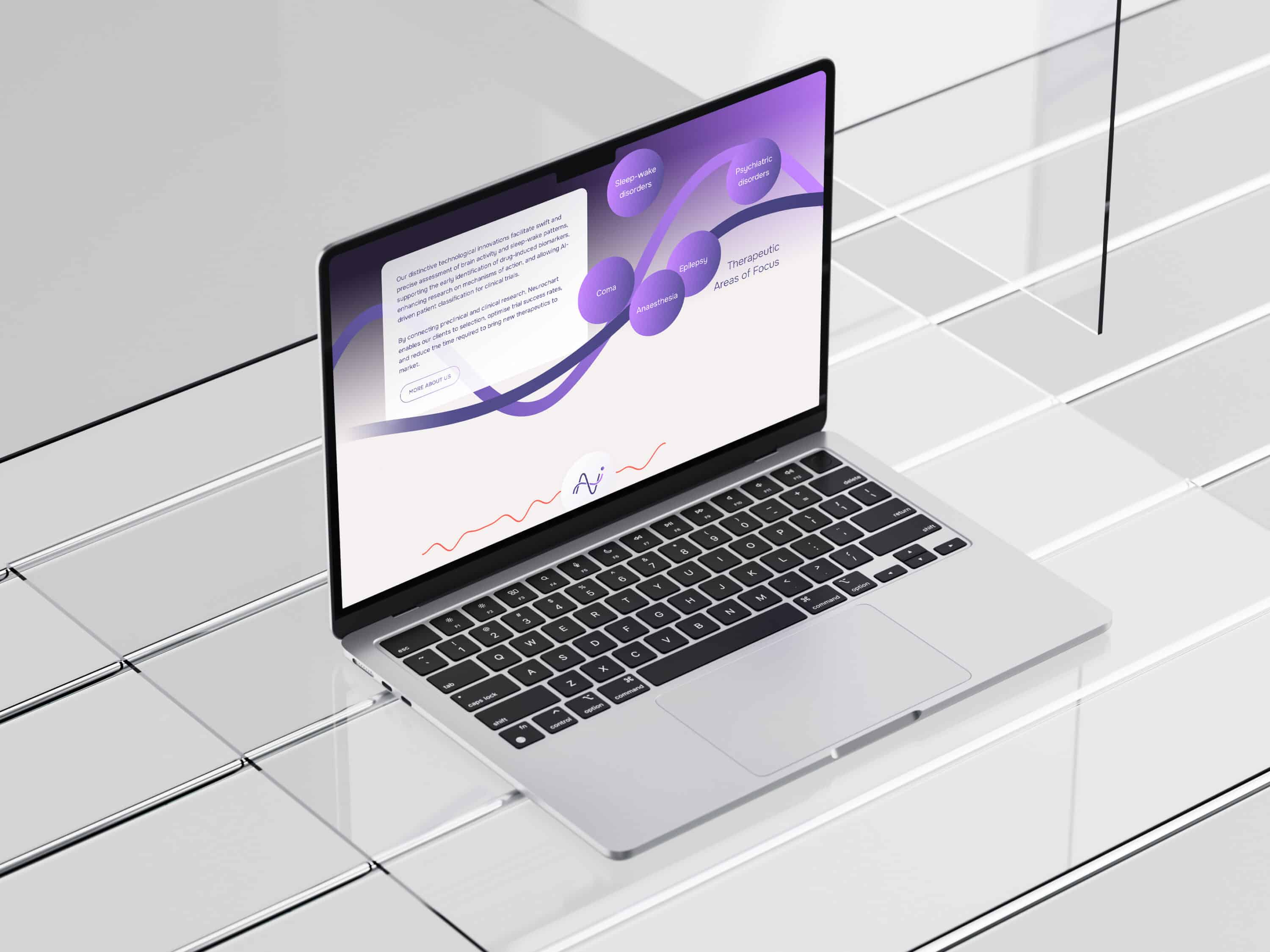 Le logo symbolise l’interaction entre les signaux EEG et les biomarqueurs. Sa forme évoque un N, tout en dissimulant les lettres AI, reflétant l’usage de l’intelligence artificielle pour l’analyse.